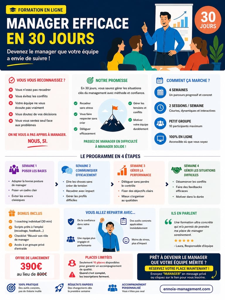 “En 30 jours, vous devenez un manager capable de gérer les situations clés du quotidien sans stress ni improvisation.”
